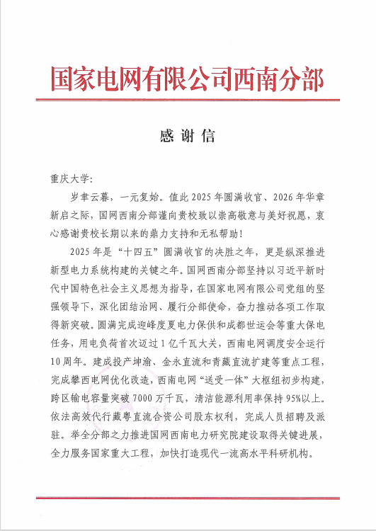 深化校企合作 共担时代使命 为服务中国式现代化注入强劲动能——国家电网西南分部致信感谢重庆大学合作贡献近日,国家电网有限公司西南分部给重庆大学发来感谢信。感谢我校高度重视与国网西南电力研究院交流合作,深入对接需求优势,聚焦电力装备、防灾减灾、工程基建等领域,在科研布局、技术支撑、实验能力建设、人才队伍培养等方面达成重要共识,为后续深化校企合作奠定了坚实基础。未来,我们将携手继续深入贯彻落实习近平...