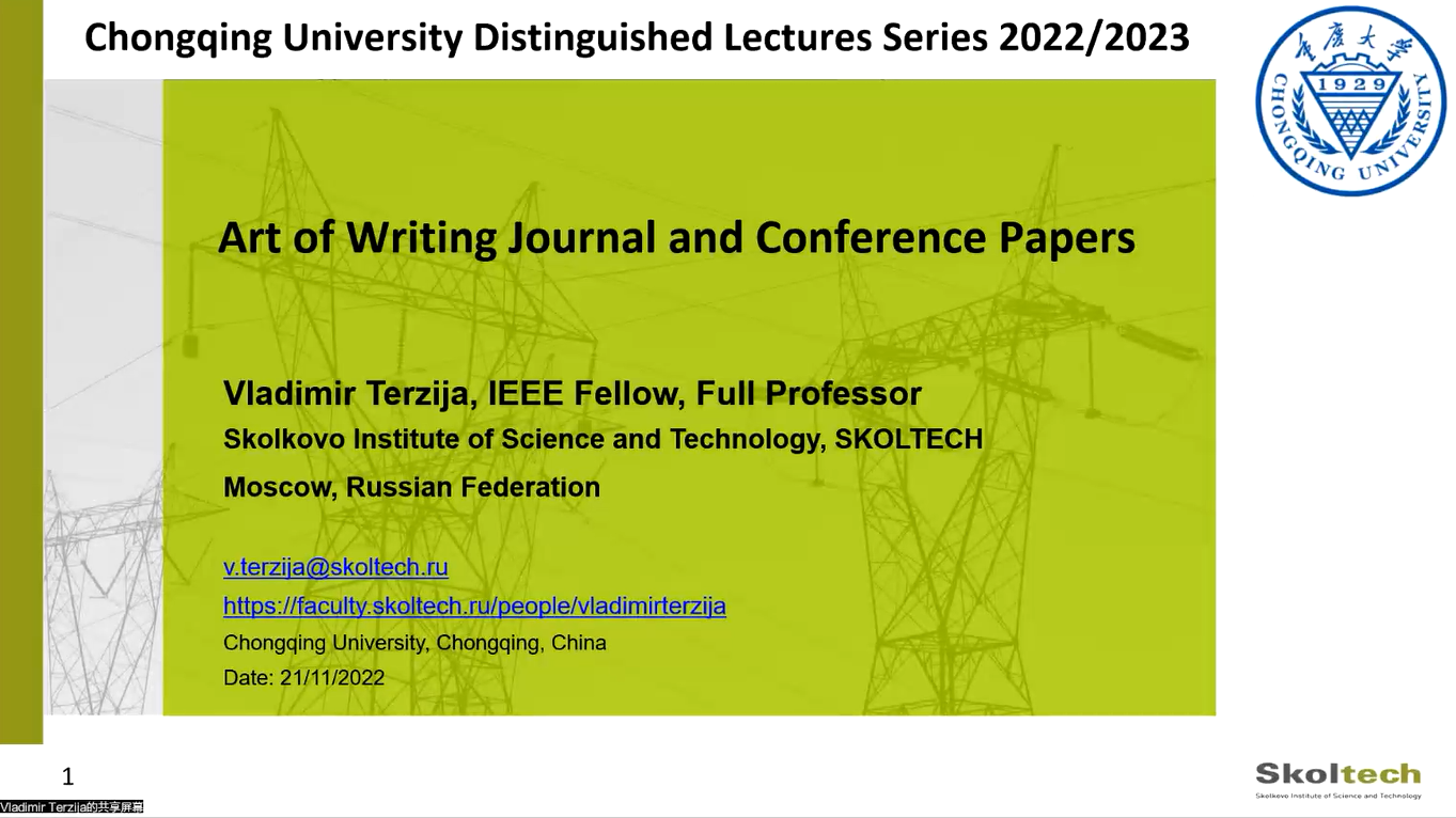 2022年11月21日下午,俄罗斯Skolkovo科学技术研究院教授、洪堡学者、IEEE会士Vladimir Terzija做客成渝地区双城经济圈智慧能源大讲坛第十五期暨智慧能源云讲堂第三十一期,以“Art of Writing Journal and Conference Papers”为主题介绍学术论文的撰写与发表。本期讲坛由重庆大学、输配电装备及系统安全与新技术国家重点实验室和重庆大学溧阳智慧城市研究院主办,由成都地区的四川大学、电子科技大学、西南交通大学、成都理工...
