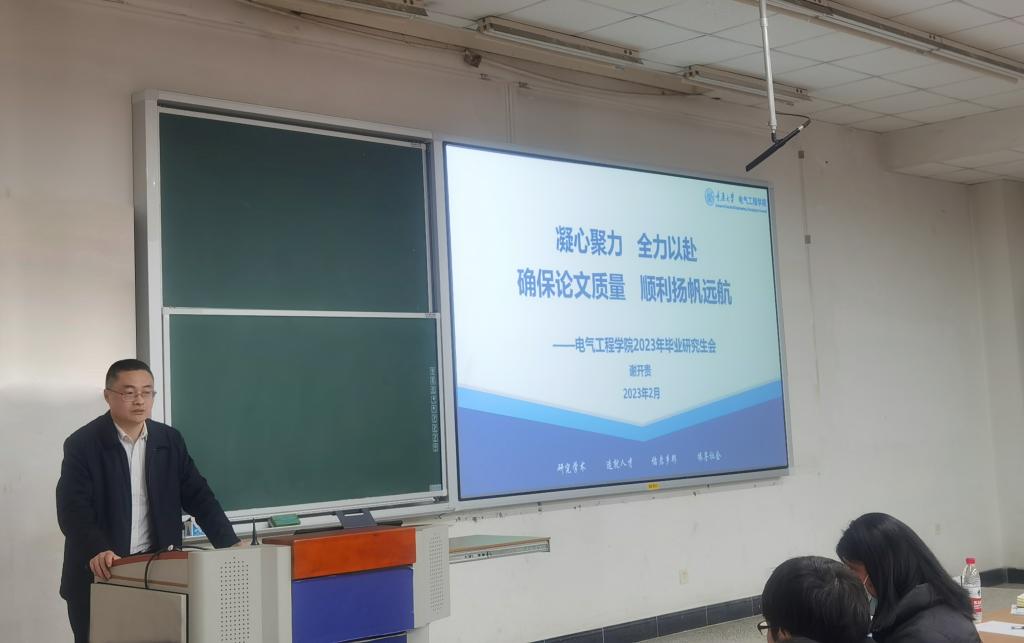 2023年2月27日,电气工程学院2023年研究生毕业动员工作会在研究生院108教室顺利召开,院长谢开贵教授,副院长张淮清教授,研究生办公室、学生辅导员和全体2023年毕业研究生参加了此次大会,会议由张淮清主持。谢开贵向大家通报了学院学位论文评阅及抽检情况,指出学位论文是体现学生学术水平和科研能力的标志性成果,很大程度上代表着学院的办学水准和人才培养质量。学院高度重视毕业生学位论文质量,勉励和要求同学们要以“昼...