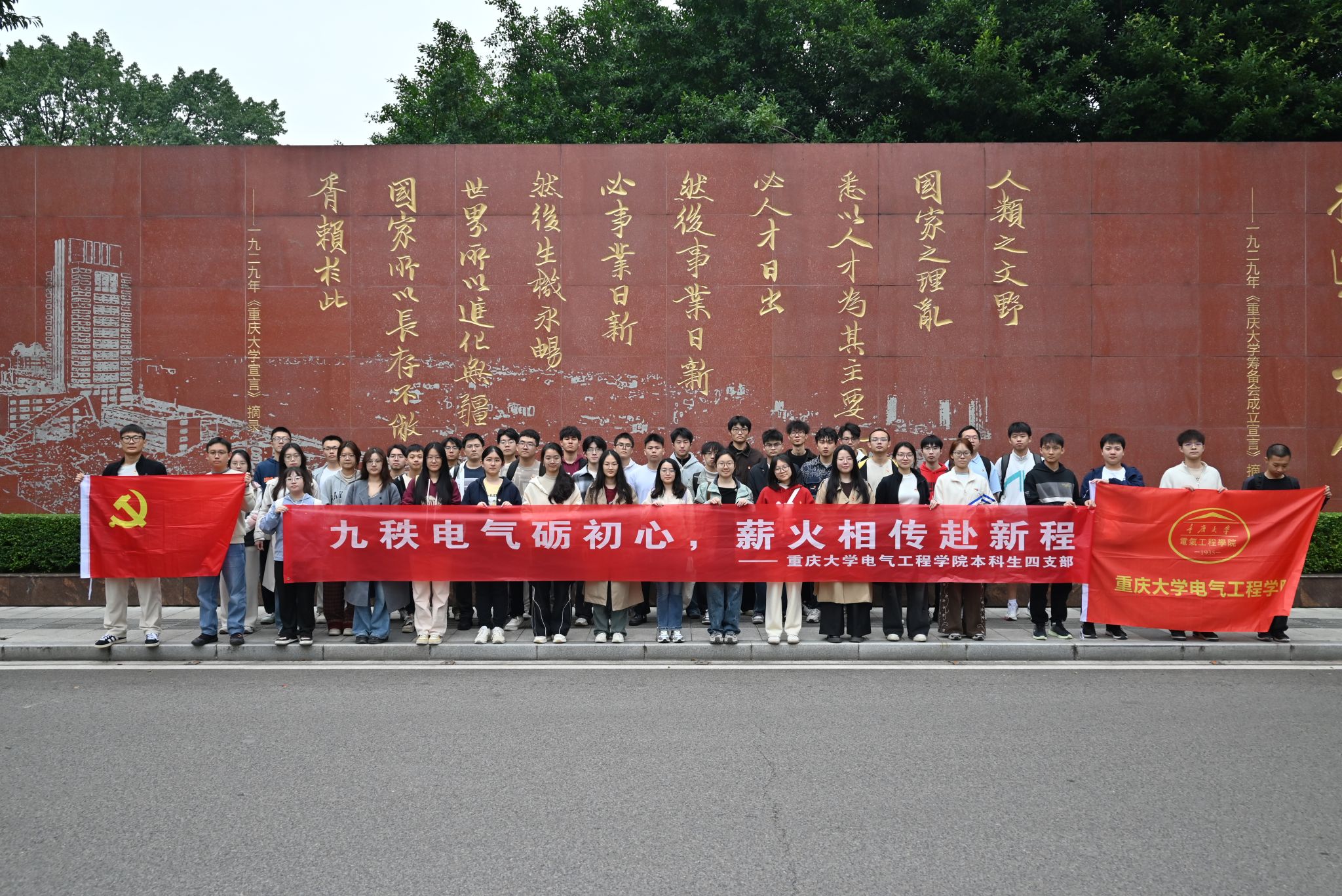 支部党员集体乘车前往沙坪坝校区A校园,开启了一场追寻校史、凝聚力量的红色之旅。在A校园风雨操场,全体党员迅速排列成“90”字样队形,手持主题横幅,齐声高呼口号并录制视频,场面庄重热烈,展现了电气学子昂扬向上的精神风貌。