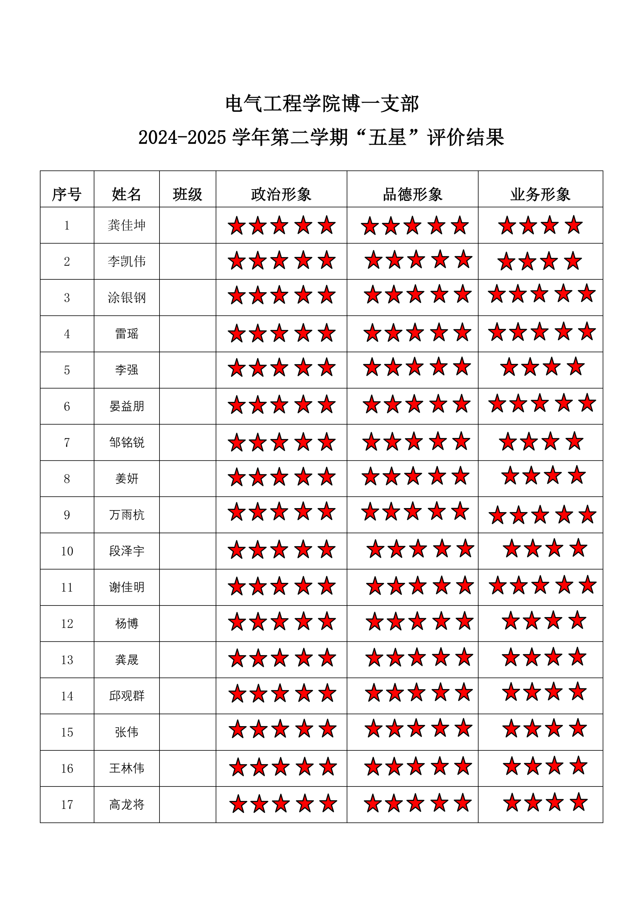 电气工程学院博士二支部 2024-2025学年第二学期“五星”评价结果