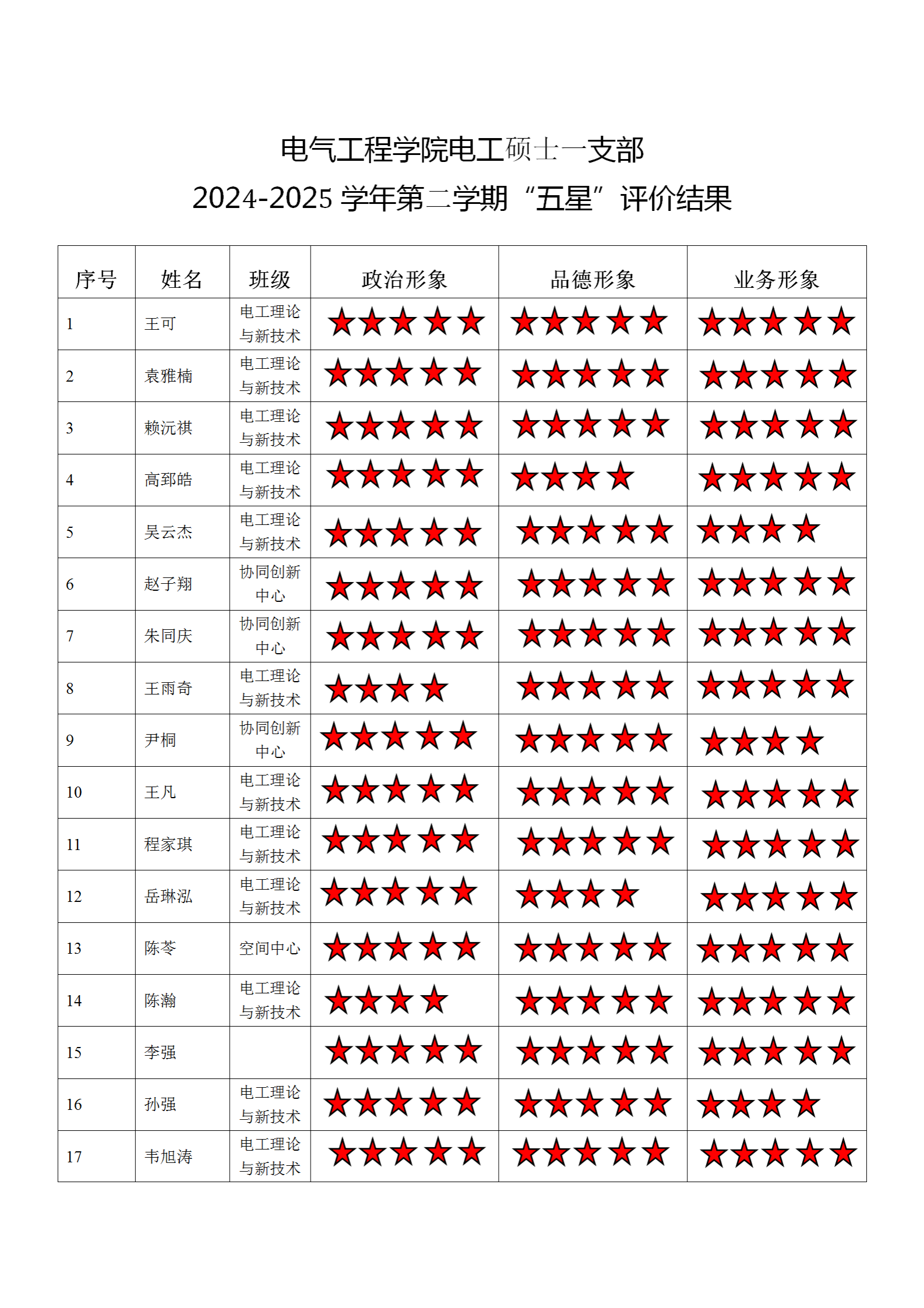 电气工程学院电工二支部 2024-2025学年第二学期“五星”评价结果