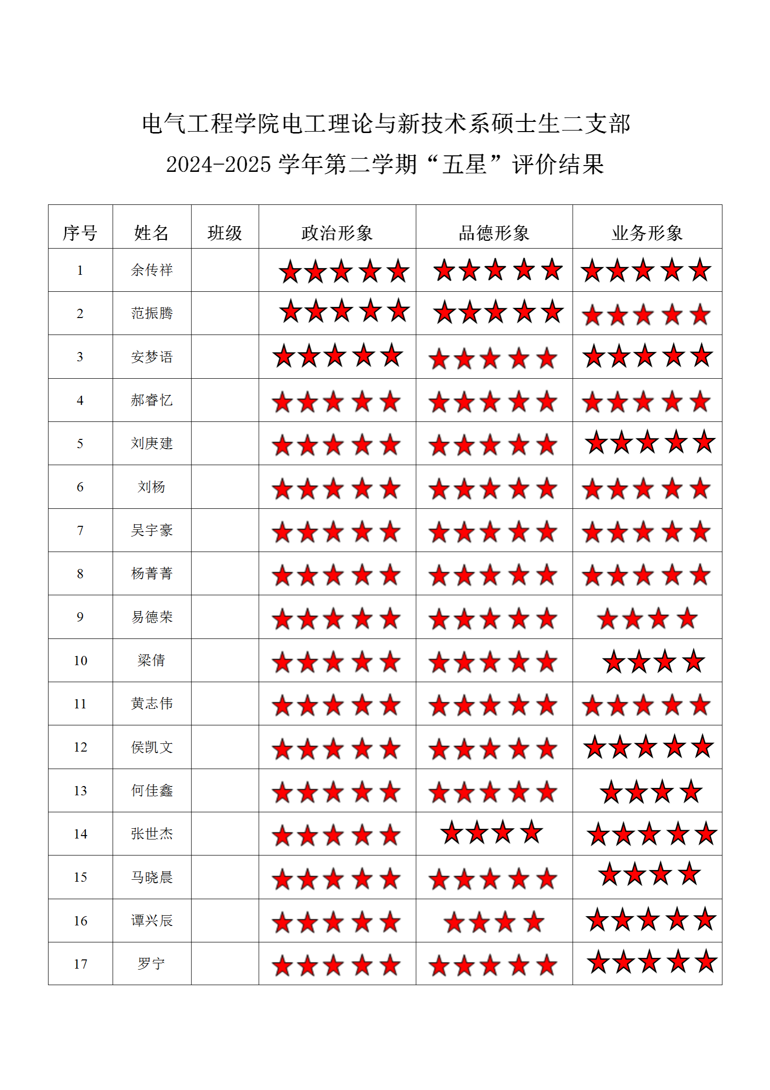 电气工程学院电工二支部 2024-2025学年第二学期“五星”评价结果