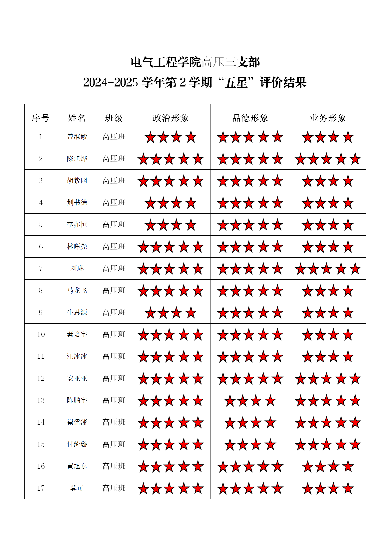 电气工程学院高压四支部 2024-2025学年第二学期“五星”评价结果