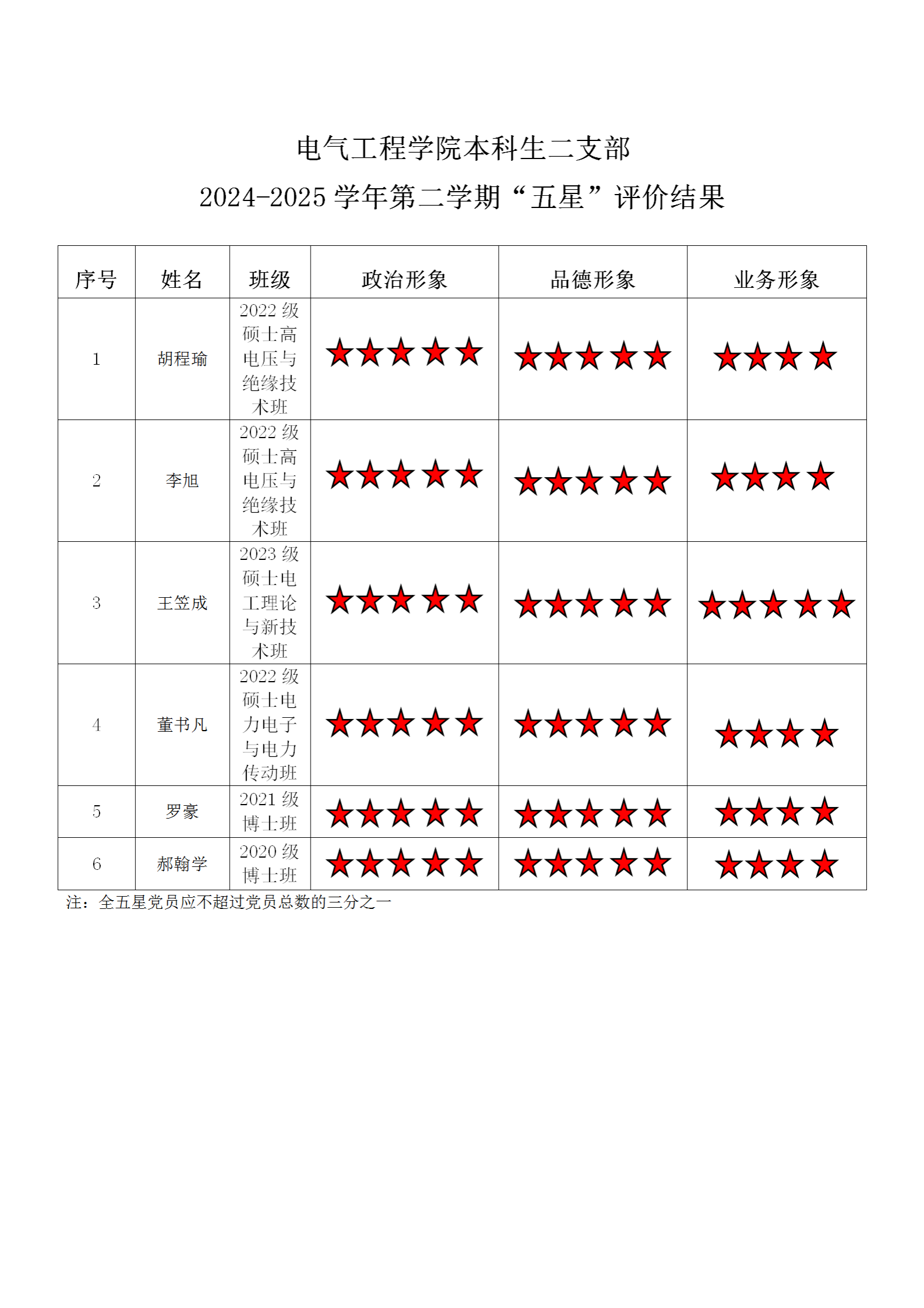 电气工程学院本科生二支部 2024-2025学年第二学期“五星”评价结果