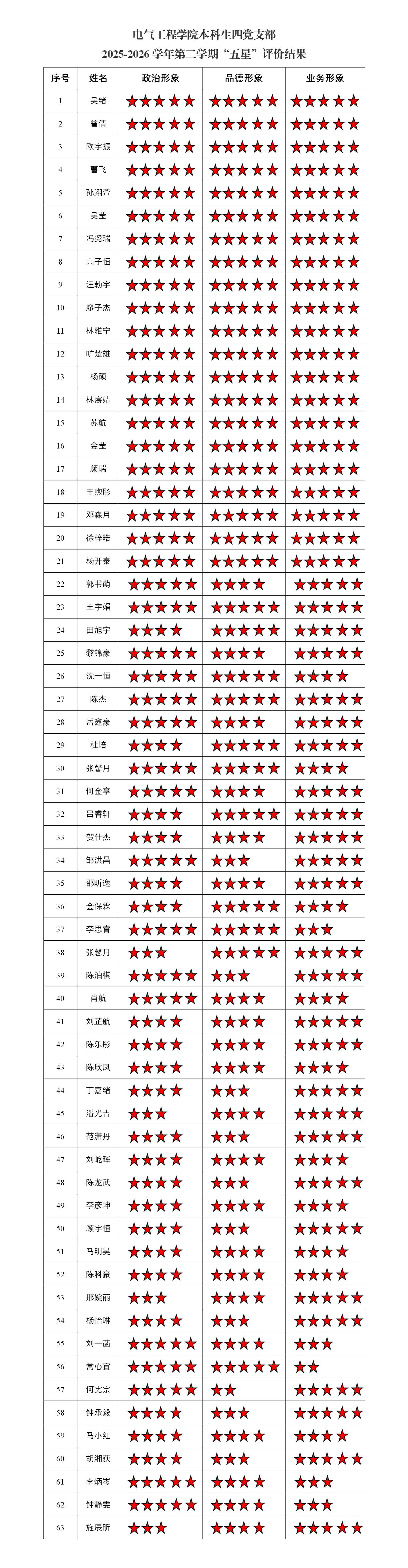 电气工程学院本科生一党支部2025-2026学年第一学期“五星”评价结果