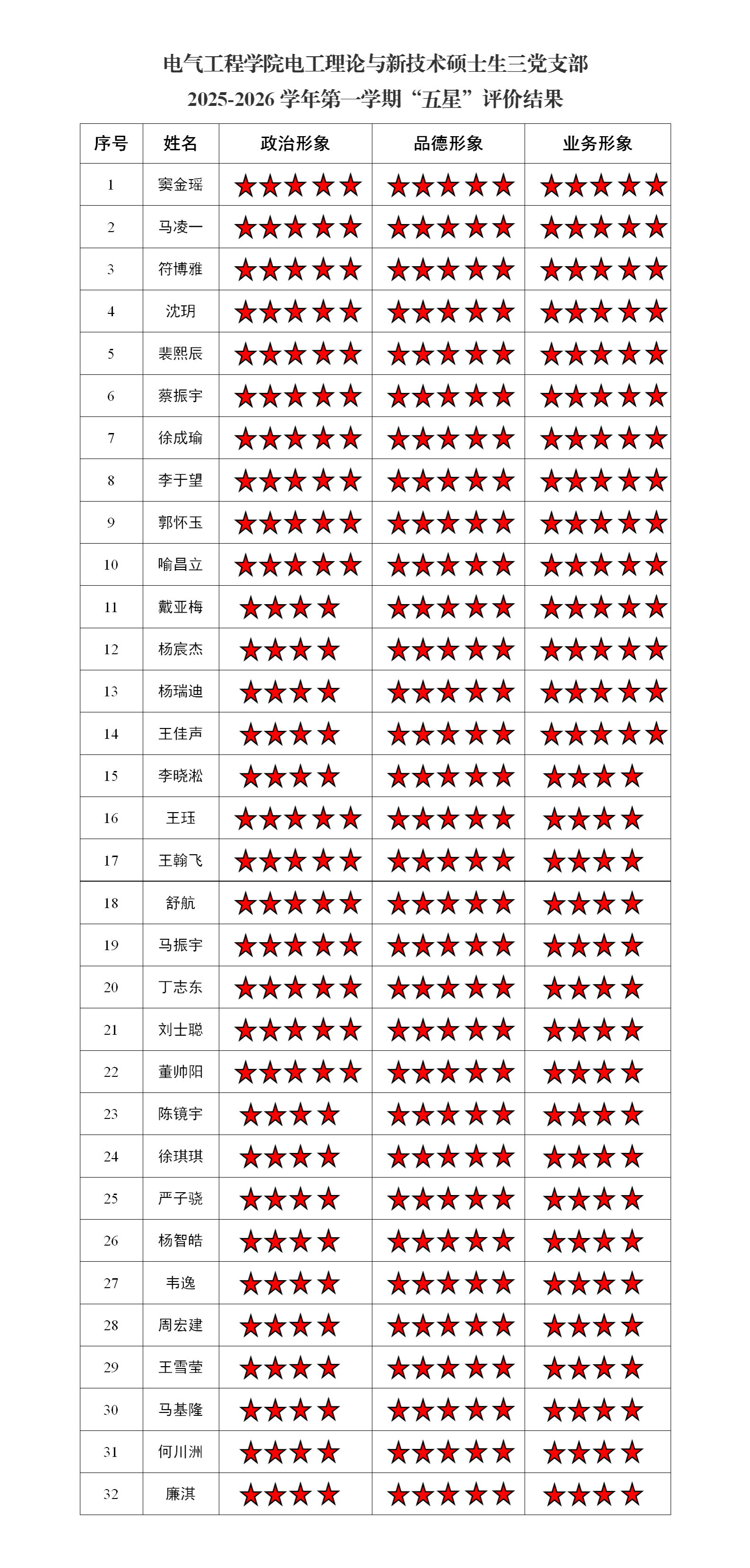 电气工程学院电工理论与新技术硕士生一党支部2025-2026学年第一学期“五星”评价结果