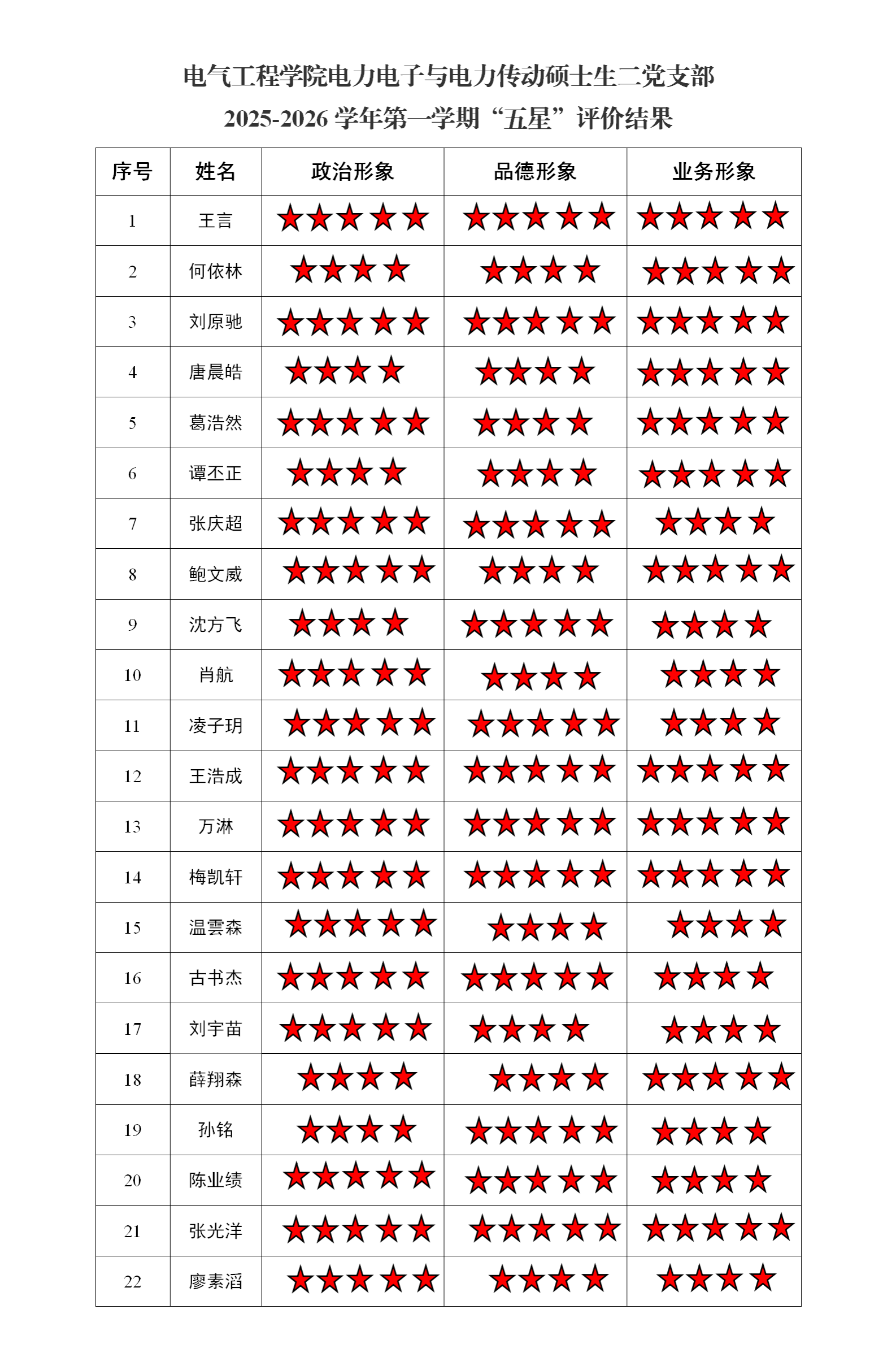 电气工程学院电力电子与电力传动硕士生二党支部2025-2026学年第一学期“五星”评价结果