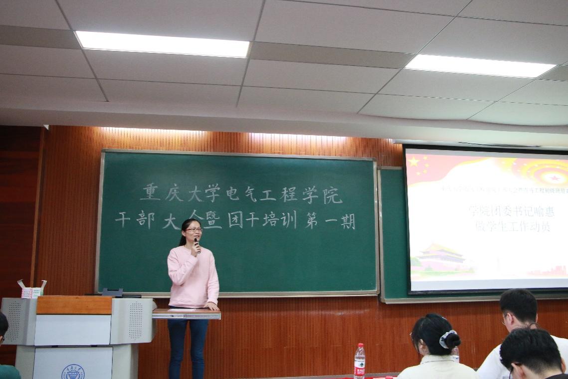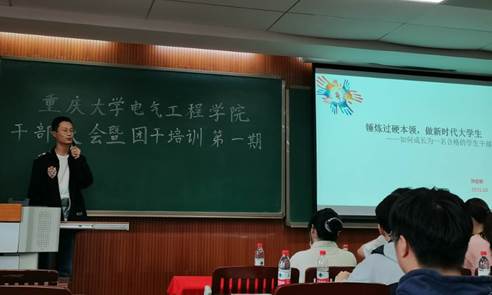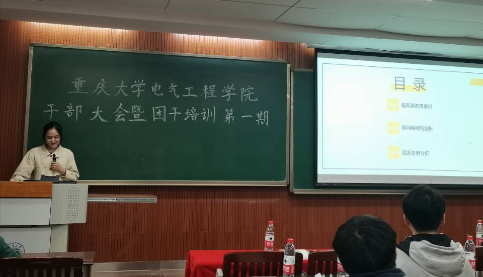 2021年10月14日14:30下午,重庆大学电气工程学院2021-2022学年干部大会暨青马工程初级班培训第一期于虎溪校区D1238教室举行。会议由张佳琪主持,电气工程学院团委书记喻惠、2020级兼职辅导员符东、原学生会主席孙启明、原新媒体中心新闻组组长赵灵芝出席会议。