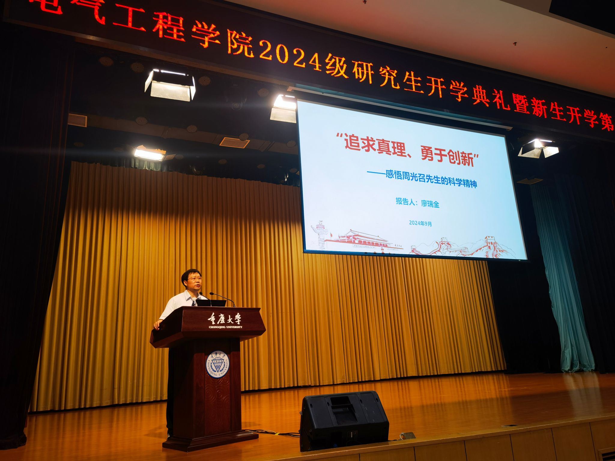 典礼结束后,国家自然科学基金创新研究群体带头人、国家重点研发计划项目首席科学家、国家级教学成果一等奖获得者廖瑞金教授以“追求真理、勇于创新——感悟周光召先生的科学精神”为题,为2024级全体研究生上了“开学第一课”。他跟大家分享了“两弹一星”元勋、中国科学院资深院士周光召先生平凡而伟大的一生,让大家在周光召先生的人生经历中感受“追求真理、勇于创新”的科学家精神,勉励大家树立远大的理想和目标,相信自己,敢于突破,并持之以恒地努力实现理想目标。