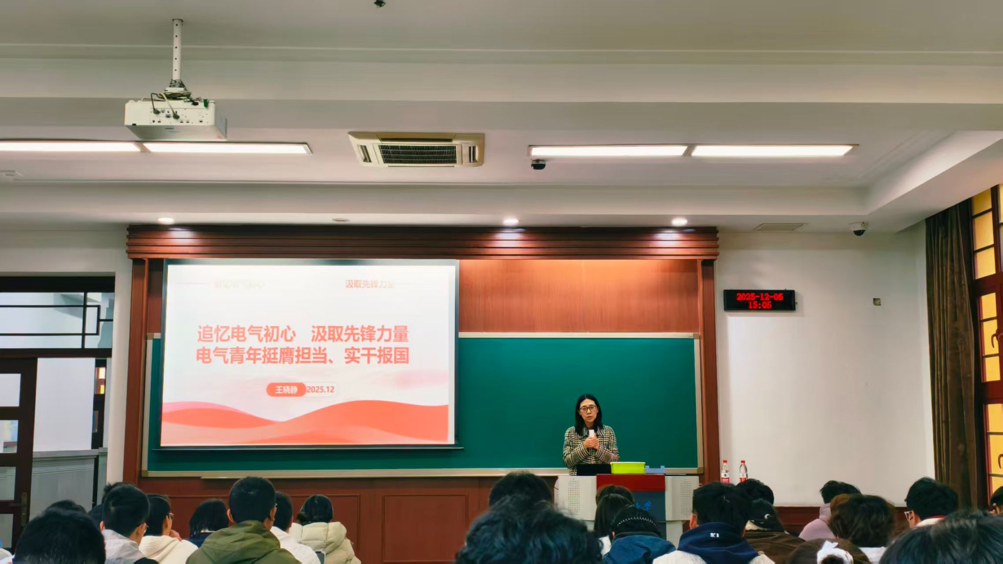 2025年12月5日下午,电气工程学院党委副书记王晓静在A5105教室,以“追忆电气初心 汲取先锋力量 电气青年挺膺担当、实干报国”为主题,为2025级本科新生带来一堂生动的院史专题课。时值电气工程学院建院(系)九十周年,本次课程旨在引领新生深入了解学院发展历程,传承优良传统,明确使命担当。