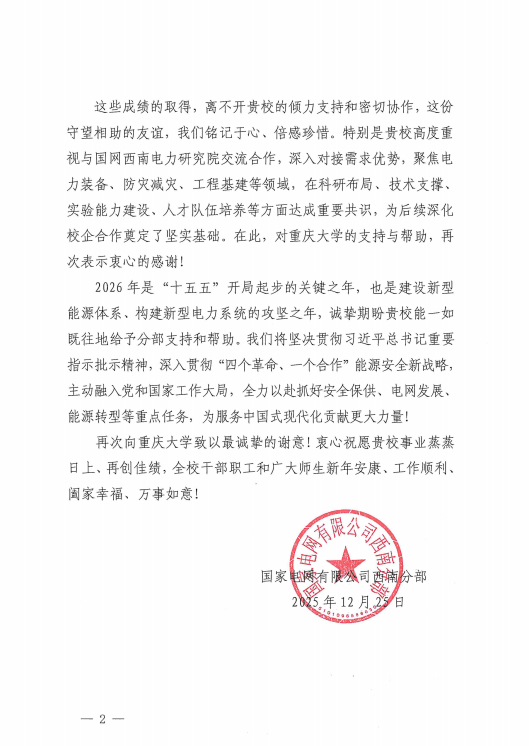 ——国家电网西南分部致信感谢重庆大学合作贡献