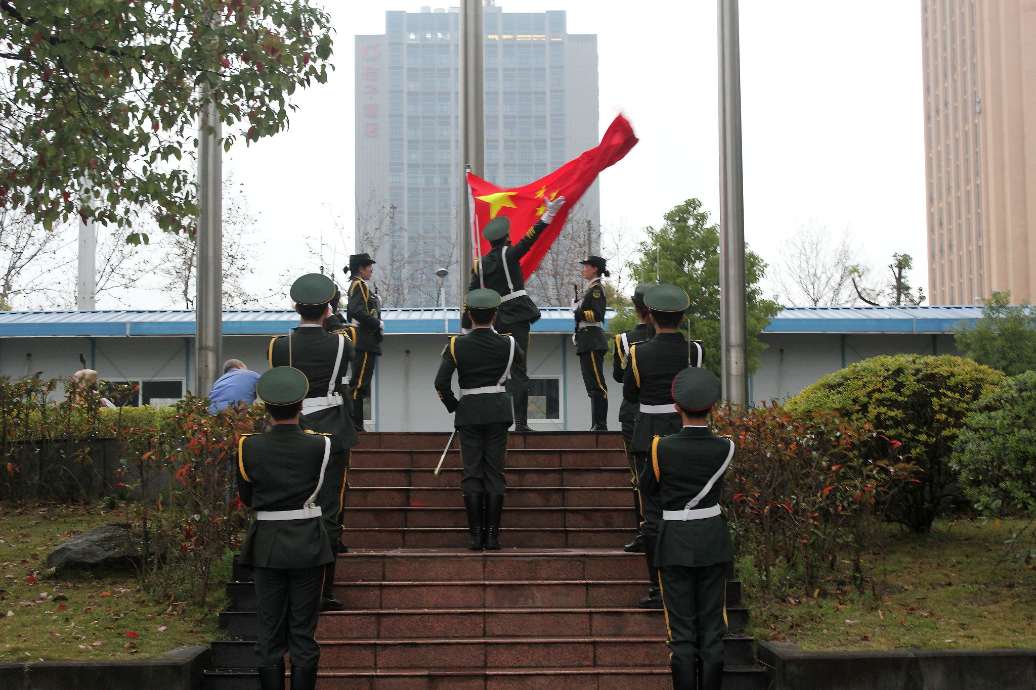 迎着清晨的朝阳,升国旗仪式正式开始。出旗队伍步伐铿锵、身姿挺拔,护送国旗走向升旗台。伴随着雄壮的中华人民共和国国歌《义勇军进行曲》,五星红旗冉冉升起,全体人员肃立行注目礼,齐声高唱国歌。