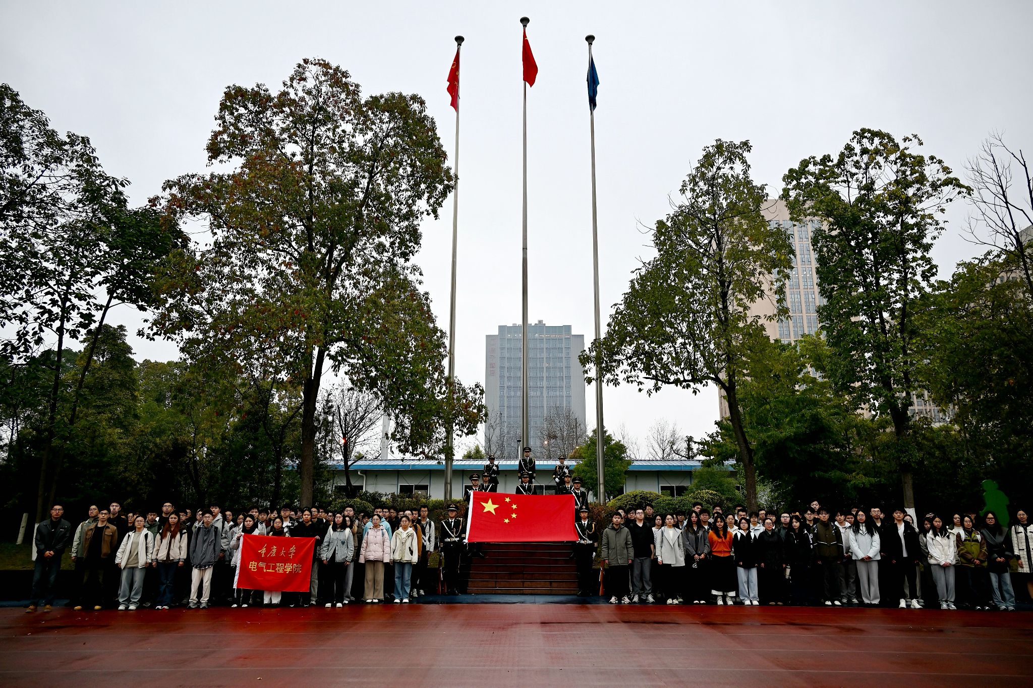 2026年3月9日清晨,电气工程学院组织部分本科生党员及本科2023级、2024级部分同学在重庆大学科学城校区虎溪校园北门操场参加升国旗仪式,开展爱国主义教育主题活动。